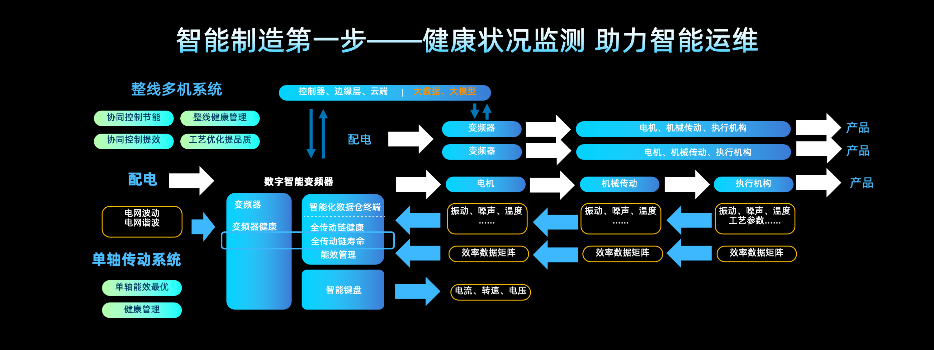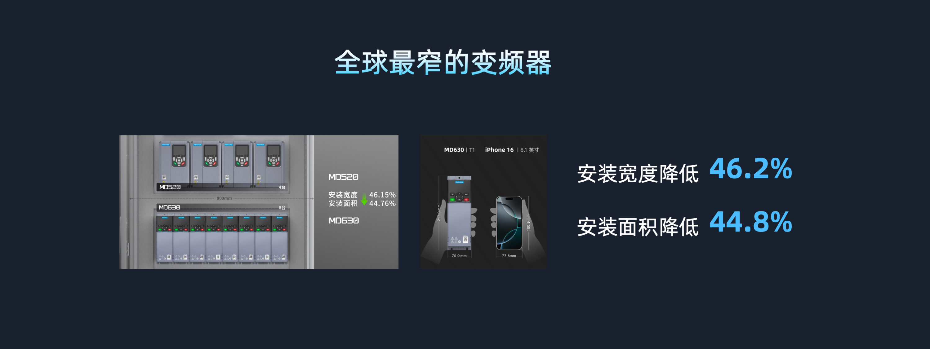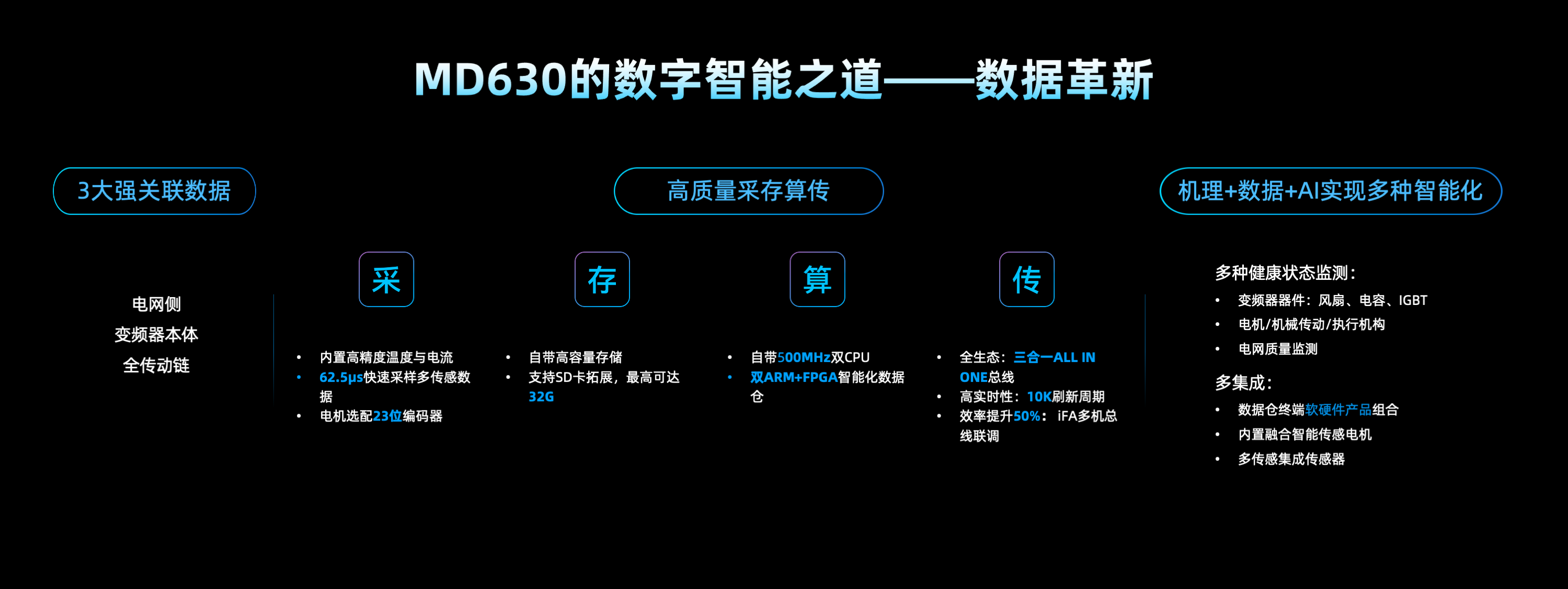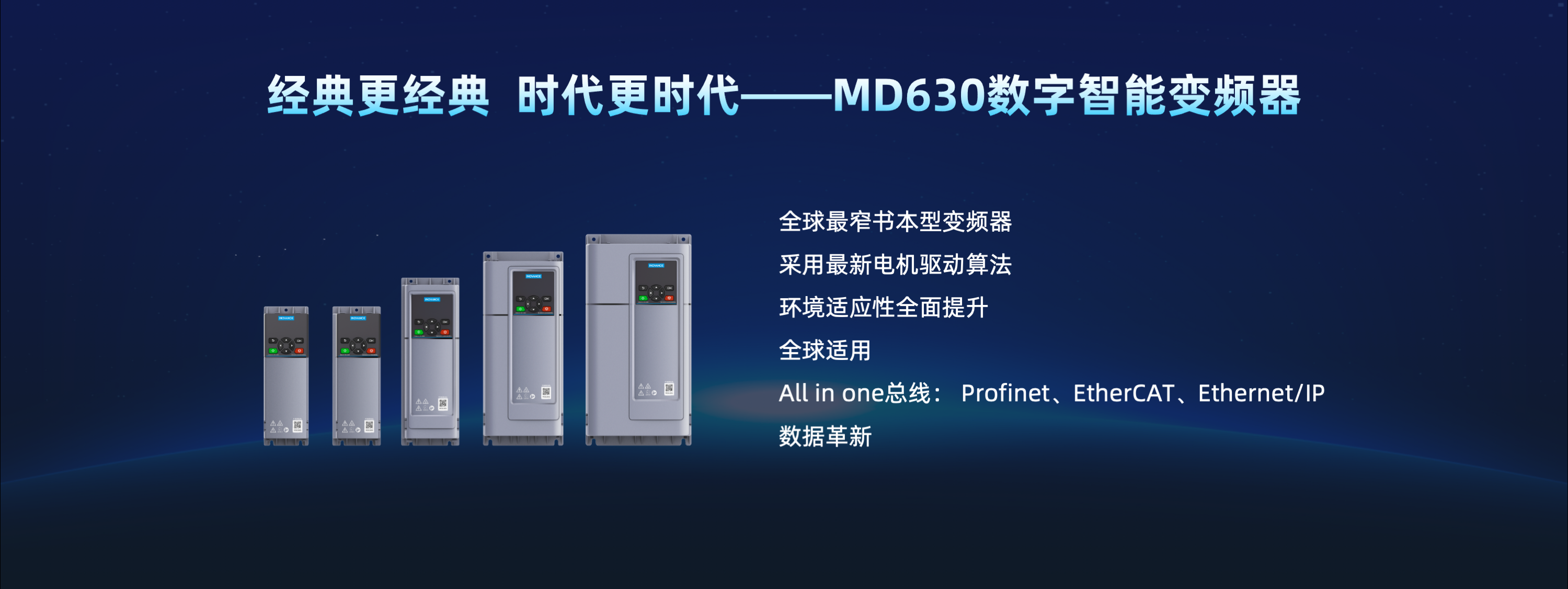 MD630 系列全球通用型數字智能變頻器,產品體積緊湊,同等配置下對比上一代產品節省電柜空間30%以上;控制性能和技術規格升級,提升設備生產效率和良品率,徹底解決EMC干擾問題;針對變頻器本體和傳動鏈數據的采、存、算、傳四大節點進行升級,支持核心關鍵數據的采集,30組故障歷史數據的長時間存儲,結合工況數據做核心器件壽命預測,再通過ALL IN ONE總線傳送到多層控制系統,實現設備、產線、車間級的數字化升級;產品符合全球認證,主要應用于汽車裝備、半導體、食品飲料、醫藥、包裝、玻璃、陶瓷、硅晶、鋰電、3C、機床、紡織等行業。